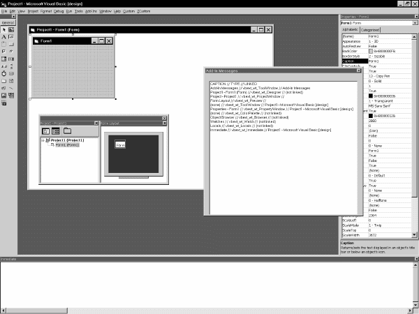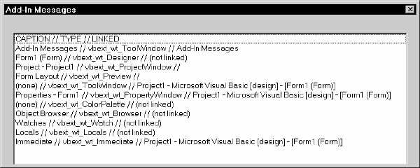 Note that we do not create new windows directly; the Windows collection has no Add method. Instead, we activate a particular VB component (form or module), which will cause VB to create a Window object for that component. We will discuss the Activate method of the VBComponent object later in the book.
