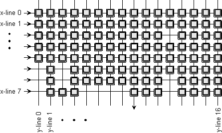 Inside the keyboard, there is a matrix of criss-crossed wires, referred to as x-lines and y-lines, as shown in Figure 9.2. At the intersection of the x and y lines is a switch that is closed when the corresponding key is pressed. When the switch closes, it connects the underlying x and y lines. Circuitry in the keyboard constantly sends a current through the x-lines. If a switch is closed (key pressed), the current will flow onto the corresponding y-line. In this way, the keyboard processor can detect when a given key is pressed and also when it is released.