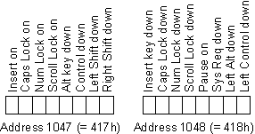 The interrupt 9 keyboard service routine is fairly complicated, since it needs to keep track of a number of different cases. For instance, the BIOS checks to see if the key pressed is a shift key (Ctrl, Shift, or Alt keys) or a toggle key (such as Num Lock or Shift Lock). This information is recorded in a two-byte section of the BIOS data area at addresses 417h and 418h, as shown in Figure 9.3. These are referred to as the keyboard status bytes. This information, being in RAM, is easily accessible by all applications, and also easily changed by the programmer, as the next experiment shows.